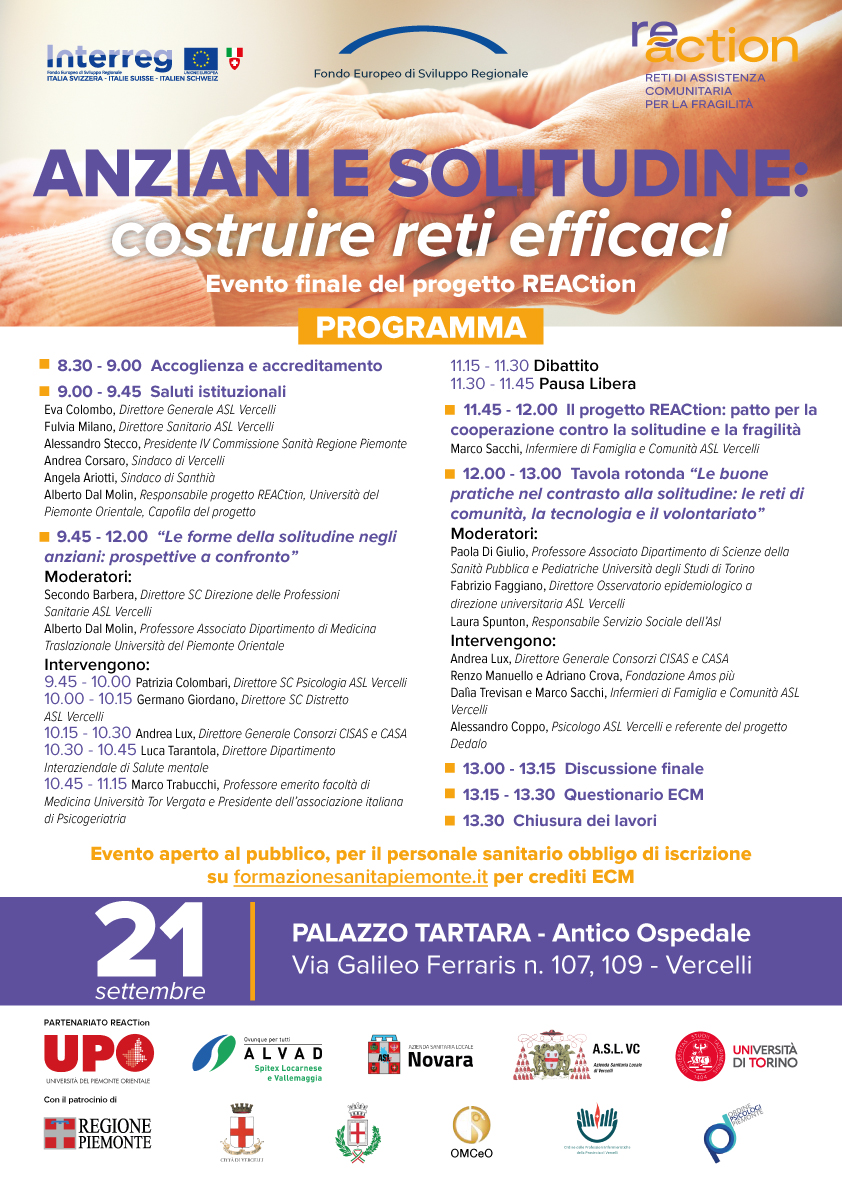 L’Asl di Vercelli organizza l’evento dal titolo “Anziani e solitudine: costruire reti efficaci”, in data 21 settembre 2023, dalle 8,30 alle 13,30, presso Palazzo Tartara – Antico ospedale (Via Galileo Ferraris n.107, 109 – Vercelli).